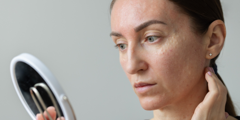 - Uneven tone: Dark patches or dull patches stand out.